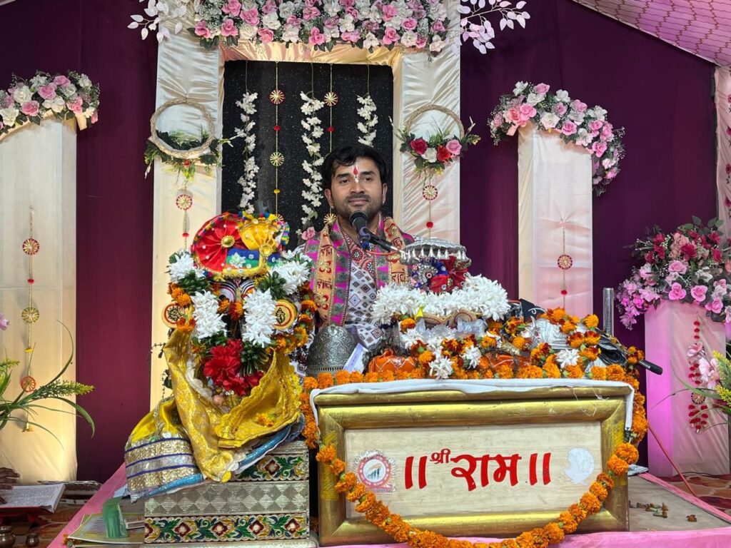 कथा वाचक डॉ. महेंद्र मिश्रा जी महाराज कथा सुनाते हुए