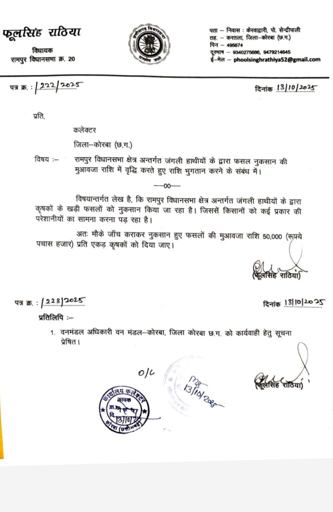कोरबा। रामपुर विधानसभा क्षेत्र के विधायक फूल सिंह राठिया ने क्षेत्र के किसानों को जंगली हाथियों द्वारा हो रहे फसल नुकसान को लेकर गंभीर चिंता व्यक्त की है। इस संदर्भ में उन्होंने कलेक्टर कोरबा को पत्र लिखकर प्रभावित किसानों के लिए मुआवजा राशि में वृद्धि की मांग की है।