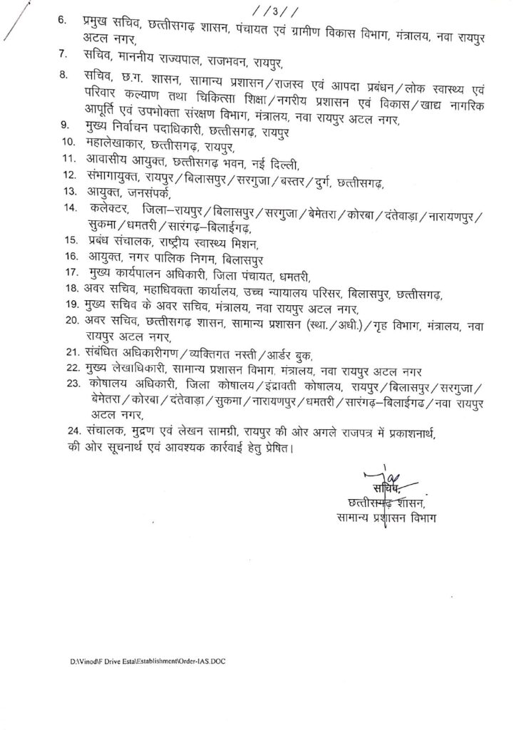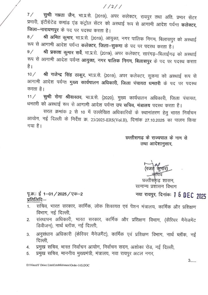 सरगुजा जिले में कलेक्टर के पद पर सेवाएं दे रहे 2011 बैच के IAS भोस्कर विलास संदिपान अतिरिक्त मुख्य निर्वाचन पदाधिकारी के पद पर पदस्थ किए गए हैं। बेमेतरा जिला कलेक्टर के पद पर सेवाएं दे रहे 2012 बैच के IAS रणबीर शर्मा प्रबंध संचालक राष्ट्रीय स्वास्थ्य मिशन के पद पर पदस्थ किए गए हैं। सुकमा जिला कलेक्टर के पद पर सेवाएं दे रहे 2018 बैच के IAS देवेश कुमार ध्रुव दंतेवाड़ा कलेक्टर के पद पर सेवाएं दे रहे हैं। नारायणपुर कलेक्टर के पद सेवाएं दे रहीं 2018 बैच की IAS सुश्री प्रतिष्ठा ममगाई बेमेतरा कलेक्टर होंगी। अपर कलेक्टर रायपुर के पद पर सेवाएं दे रहीं 2019 बैच की IAS सुश्री नम्रता जैन नारायणपुर कलेक्टर की कमान संभालेंगी। आयुक्त नगर पालिक निगम बिलासपुर के पद पर सेवाएं दे रहे 2019 बैच के IAS अमित कुमार सुकमा कलेक्टर के पद पर सेवाएं देंगे।