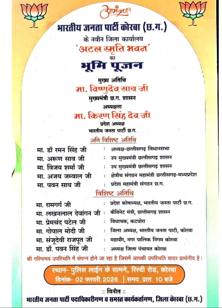 भारतीय जनता पार्टी, जिला कोरबा के नवीन जिला कार्यालय अटल स्मृति भवन” के भूमि पूजन एवं शिलान्यास कार्यक्रम का भव्य आयोजन किया जा रहा है।